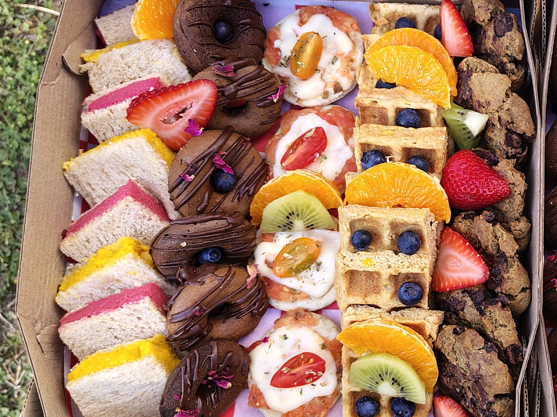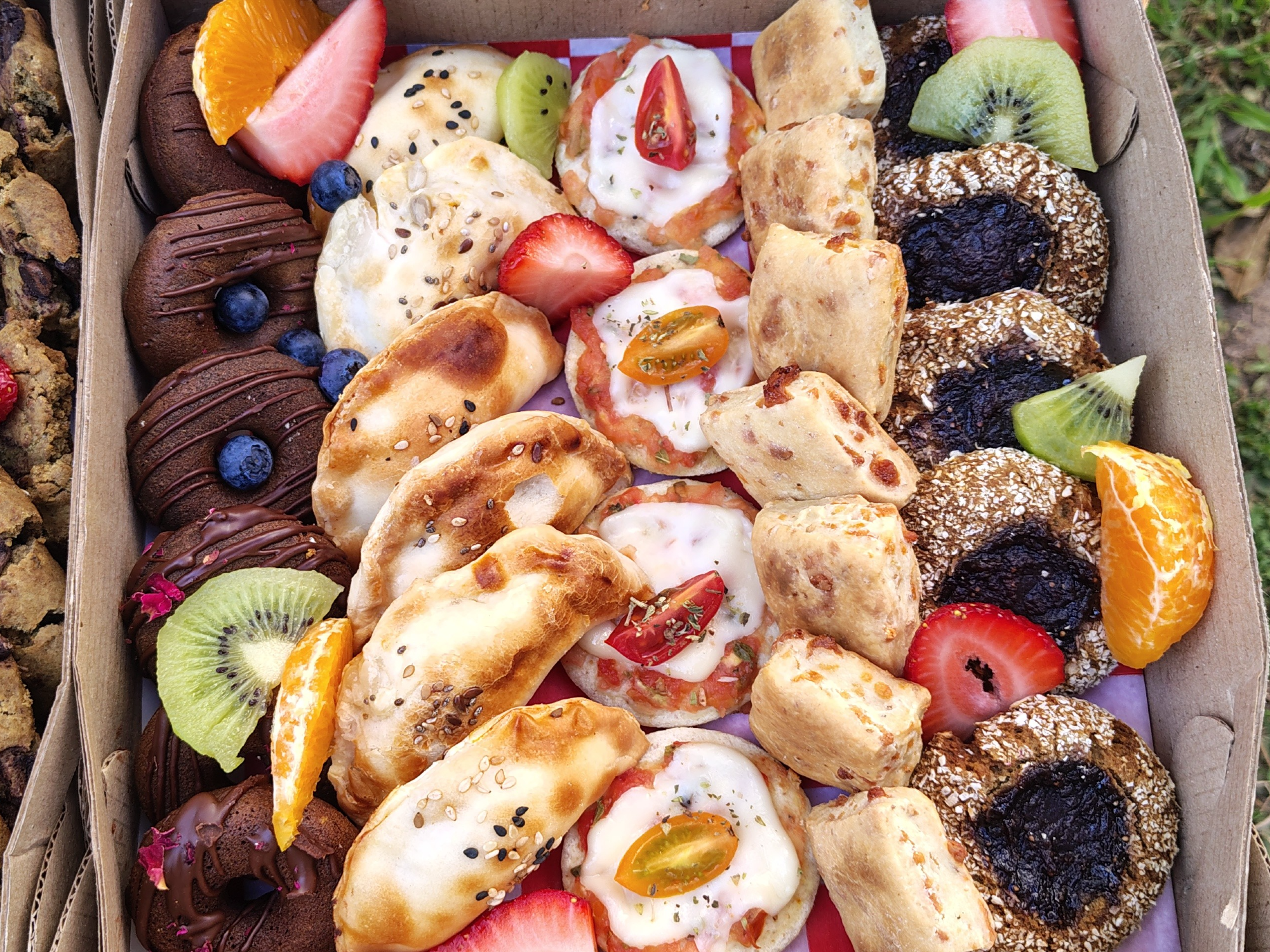 Box cumple - cón sal y azúcar Compartir por WhatsApp Copiar enlace Box degustación para los más grandes. ❗Tienen azúcar o sal 1 Box alcanza para 5 personas * Incluye frutas de estación ❗Para reservar hay 2 opciones: - Reservas pagando la totalidad del pedido y congelas el precio. - Reservas señando el 50% del total. Si el precio cambia, el saldo se actualiza. Y deberás pagar el saldo un día antes de la entrega de tu pedido.$26.000 Personalizá tu selección Las siguientes opciones aplican para cada producto agregado. Variedades para elegir (hasta 5) Seleccioná de 3 a 5 opciones. Obligatorio 6 Galletas de banana y chips Sin gluten 6 galletas de naranja y zanahoria A base de harina avena. Bañadas con choco blanco 6 Donas de chocolate Sin gluten - con harina de maní y huevos 6 Porciones de pizza sin gluten Sin gluten - con lácteos 6 Bizcochitos chipá Sin gluten - con queso 6 Sándwich's hummus bicolor A base de pan de miga integral con hummus de garbanzo saborizado con remolacha y zanahoria 6 Bocaditos de quinoa. A base de quinoa, mijo y batata. Sin gluten, sin sal y sin lácteos Observaciones 0 / 150