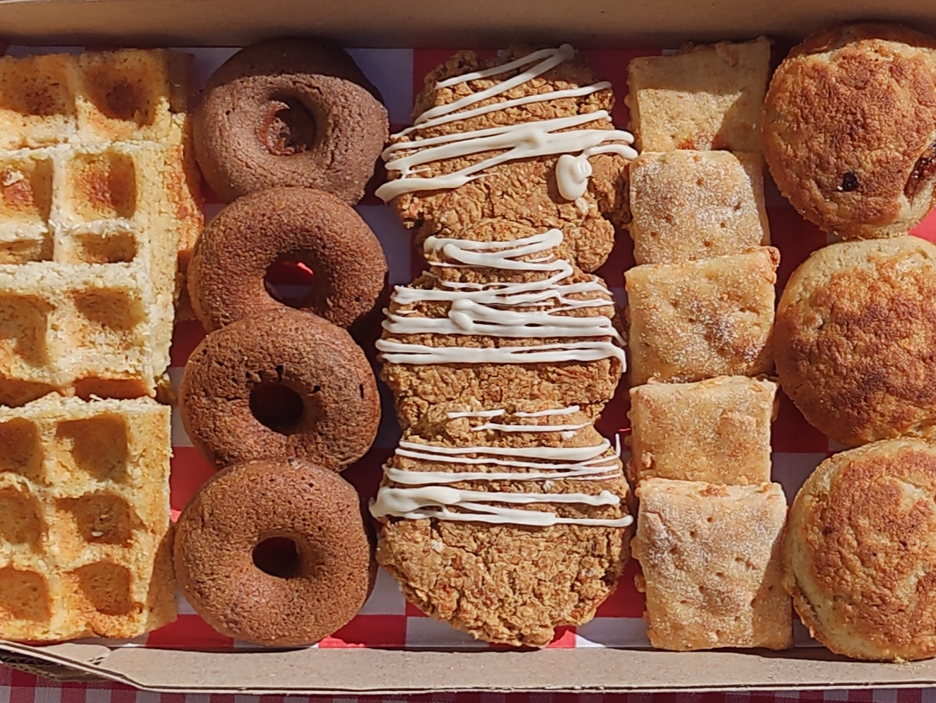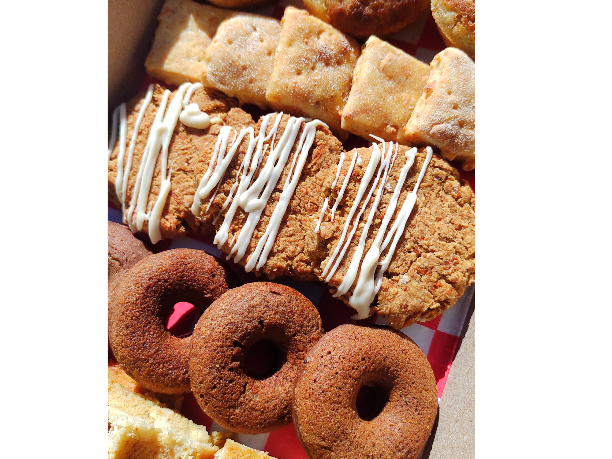 Productos CON AZÚCAR mascabo (poca) y algunos tienen SAL y lácteos. Listos para consumir. Se pueden freezar! Ideales para desayunos y meriendas. INCLUYE 6 paquetes de productos: - 1 pack de Bizcochitos chipá (100 gr.) - 1 pack de Donas de cacao y maní (6 un.) - 1 pack de Donas de ricota y nuez (6 un.) - 1 pack de Brownies de cacao, girasol y chips (6 un.) - 1 pack de galletas de naranja y zanahoria (6 un.) - 1 pack de galletas de banana y chips