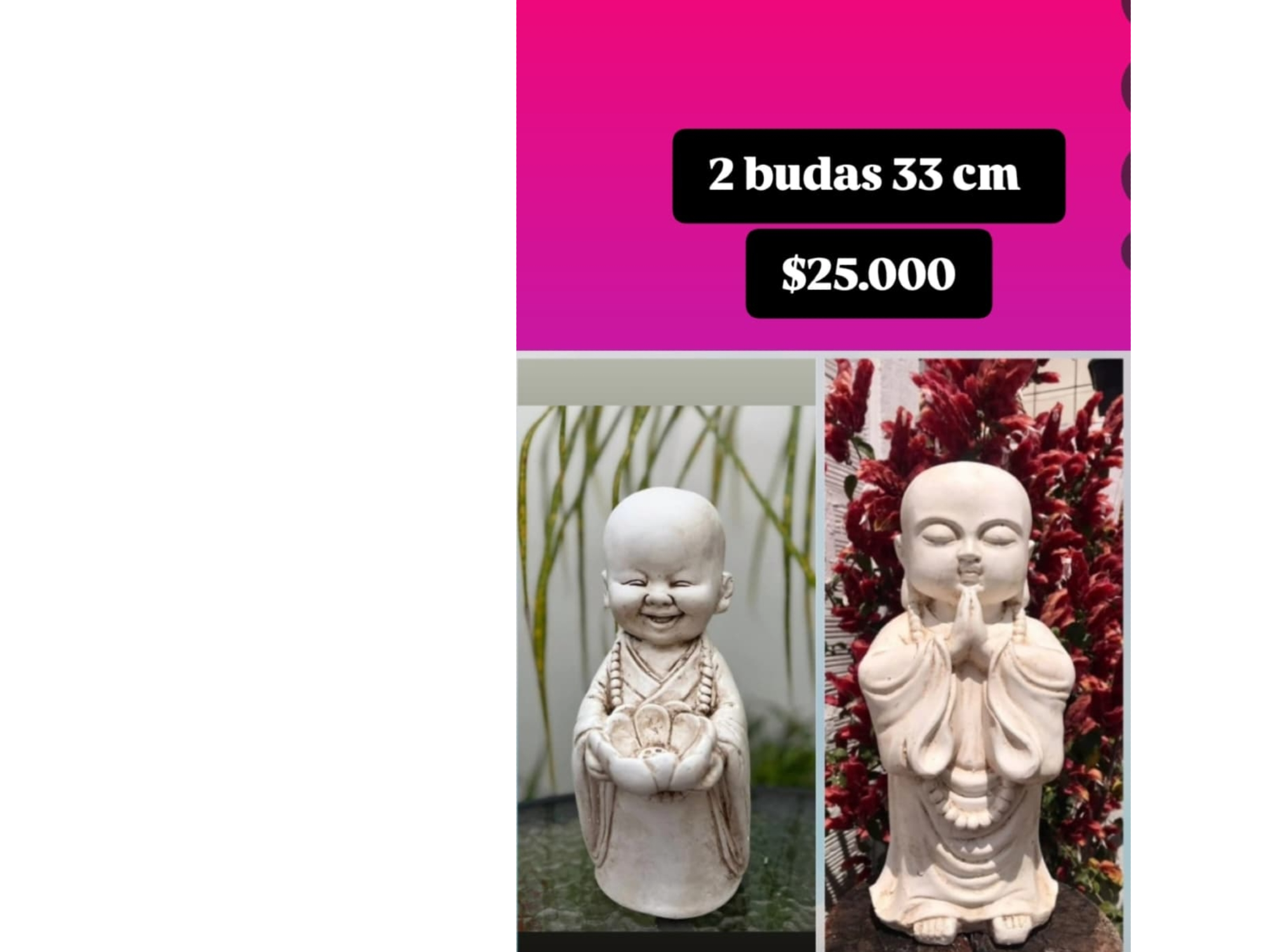 PROMOS Compartir por WhatsApp Copiar enlace Budas x 2 $25.000 30 alajeros corazon $25.000 8 budas surtidos $70.000 Sin foto E fuentes de agua $120.000 20 porta sahumerios $18.000