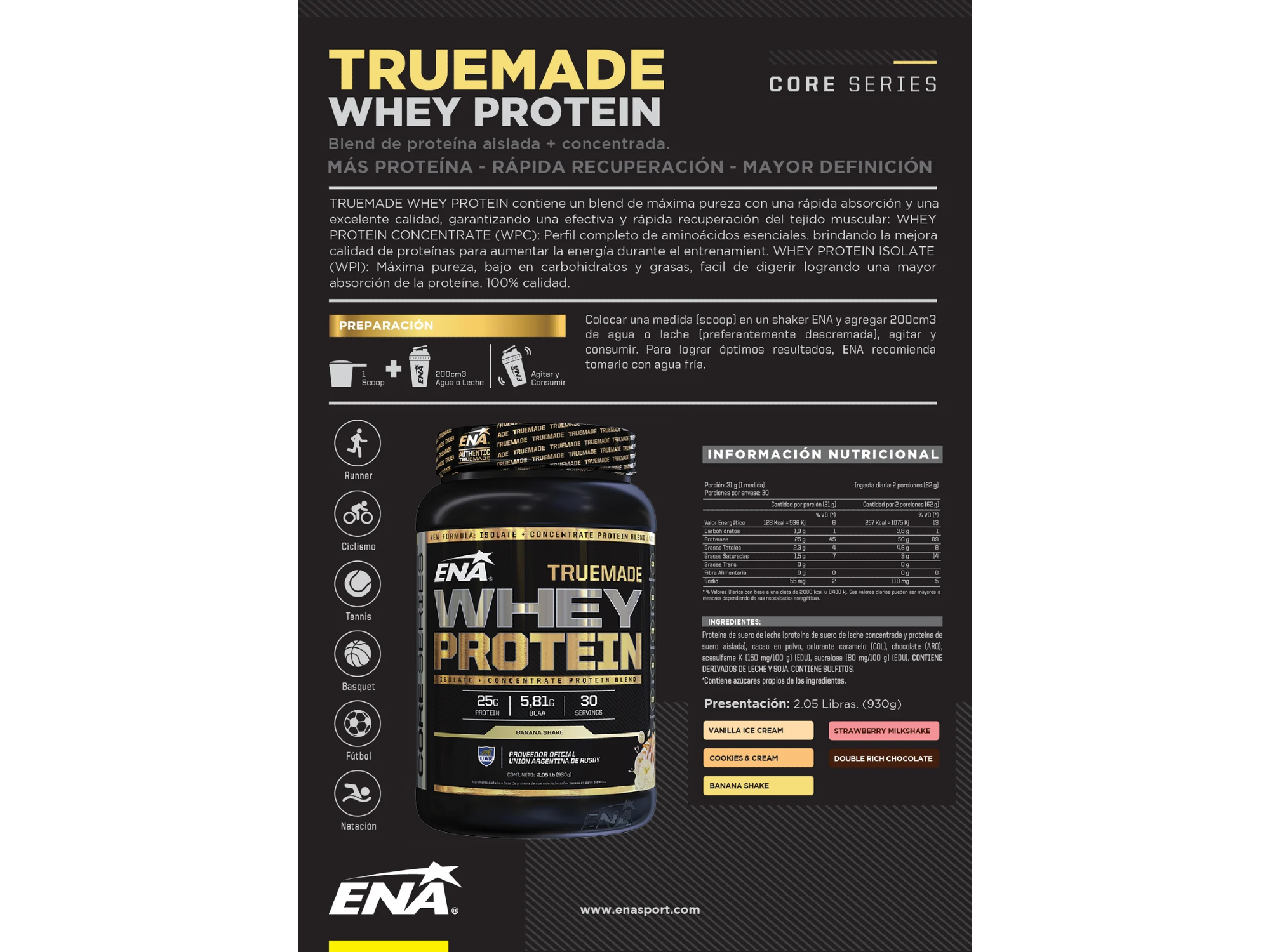 TRUE MADE Compartir Los precios no incluyen IVA Presentaciones Seleccioná una opción.Chocolate$58.000Cookies & Cream$58.000Frutilla$58.000Vainilla$58.000 Observaciones 0 / 150 Encontrá productos relacionados SUPLEMENTOS (36)