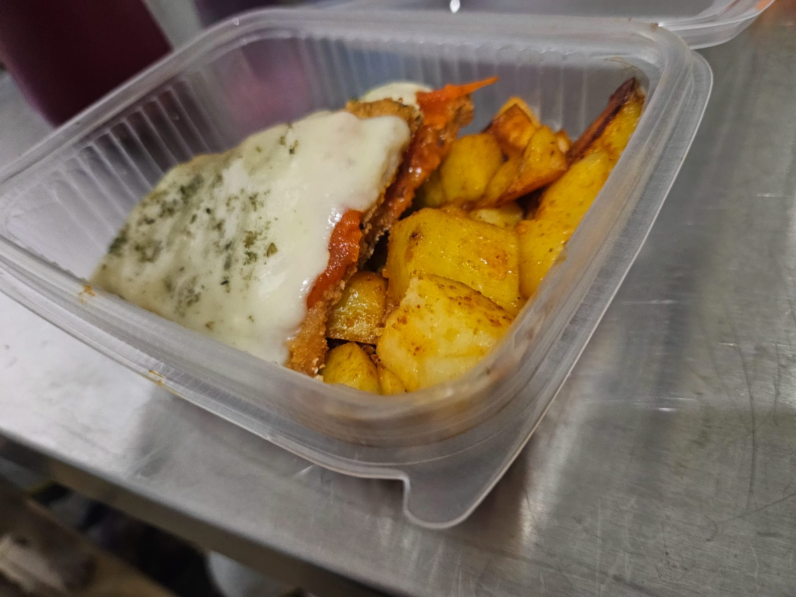 Milanesas de berenjena napolitanas con papas al horno Compartir Finas y sabrosas láminas de berenjenas, empanadas con pan rallado, huevo y condimentos acompañadas con papas al horno.$8.300$7.000 16% OFF Observaciones 0 / 150