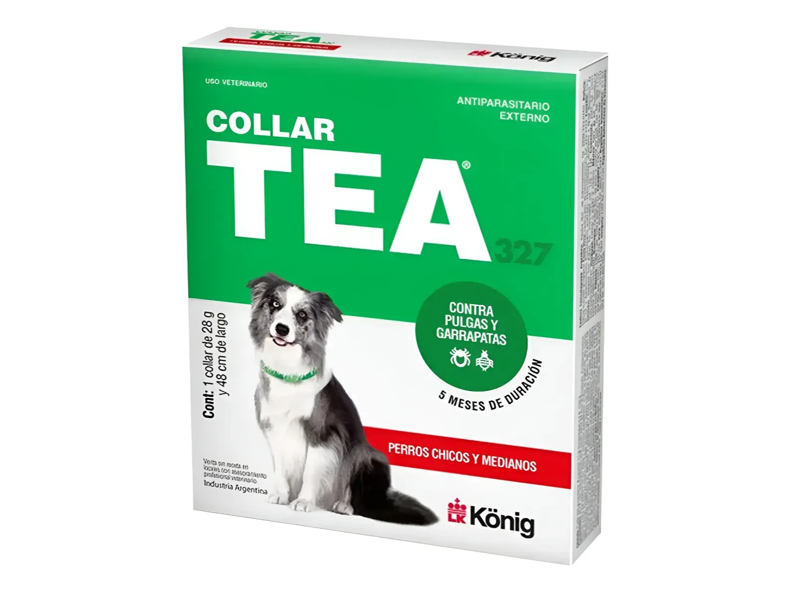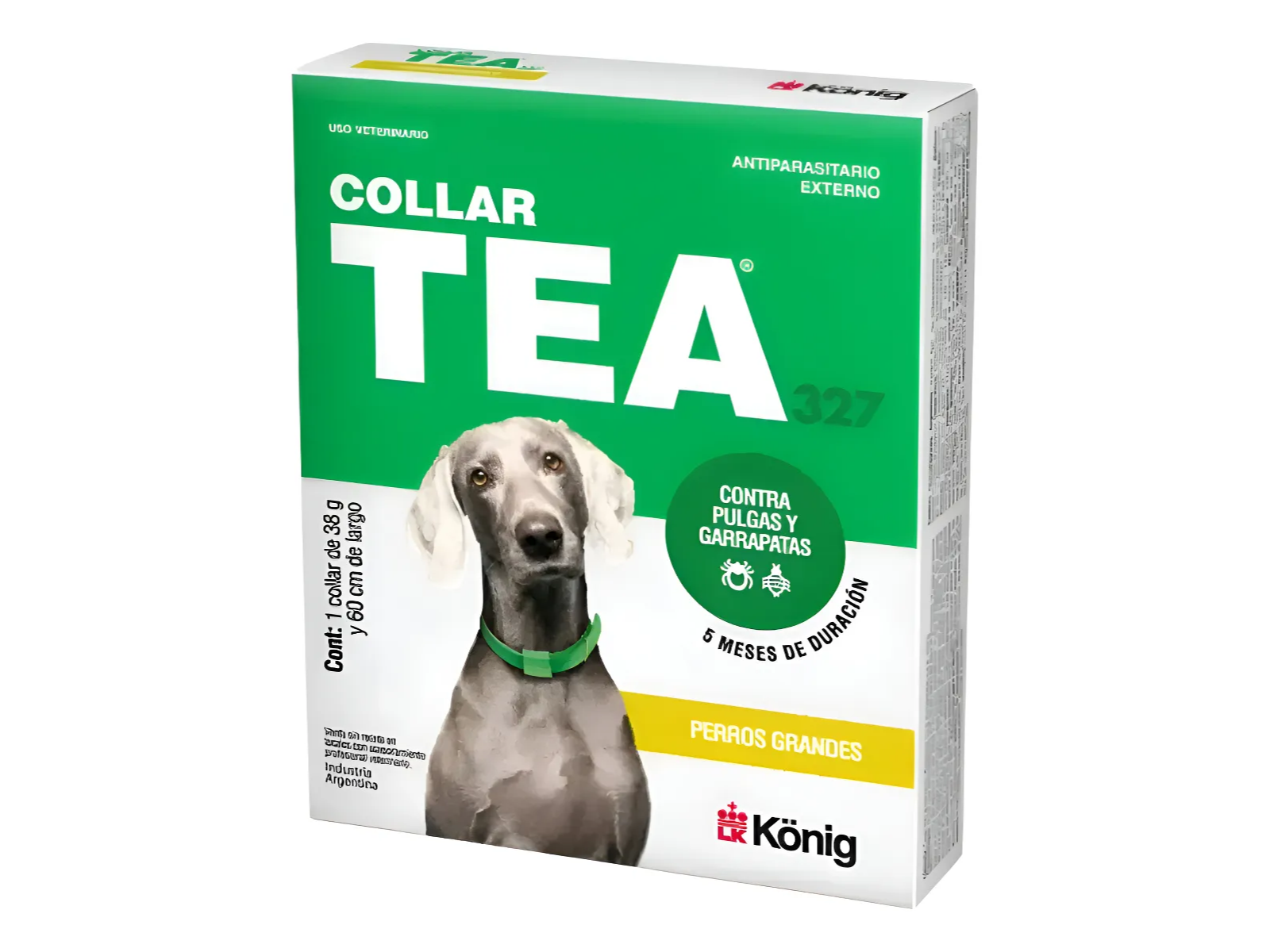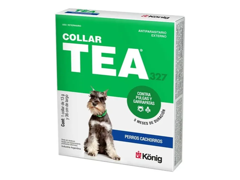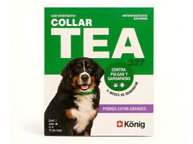 collares antiparasitarios TEA 327 de König para perros. Estos collares están diseñados para prevenir y controlar infestaciones de pulgas, garrapatas y piojos.