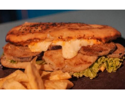 FOCACCIA VEGETARIANAPan italiano, milanesas de berenjena y zucchini, hojas verde, palta, tomate confitado, huevo frito, muzzarella, sardo, papas fritas.$16.000 Observaciones 0 / 150