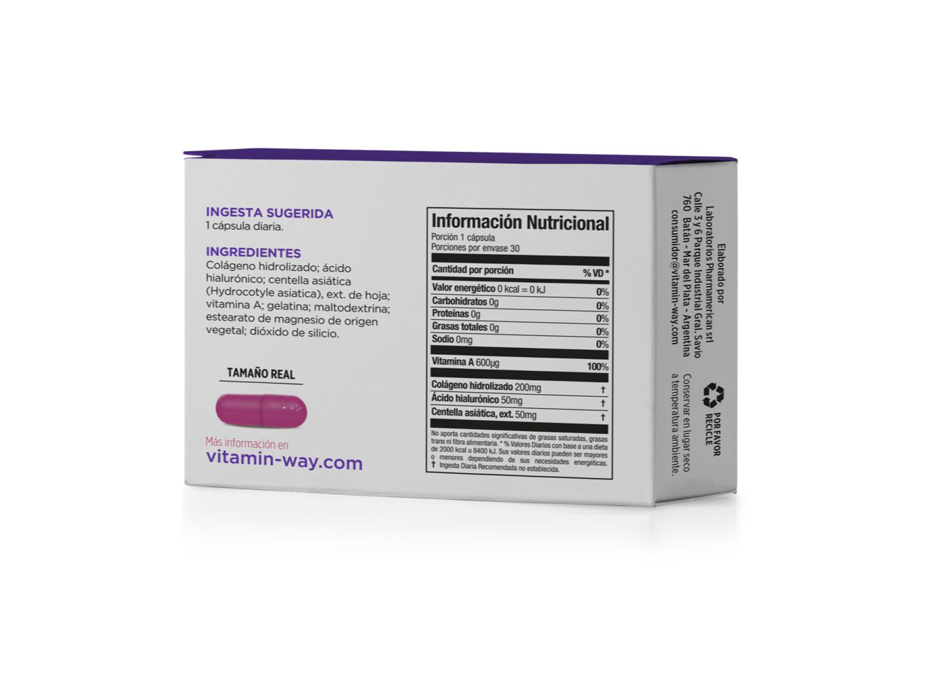 Colágeno + Hialurónico Vitamin Way® es una combinación de ingredientes funcionales que favorece la renovación de las células epiteliales y ayuda a reforzar las fibras de colágeno aportando tersura y suavidad a la piel. Colágeno + Hialurónico Vitamin Way® es una novedosa combinación con Centella asiática que favorece la microcirculación, aportando beneficios en casos de foto-envejecimiento cutáneo, celulitis y estrías.