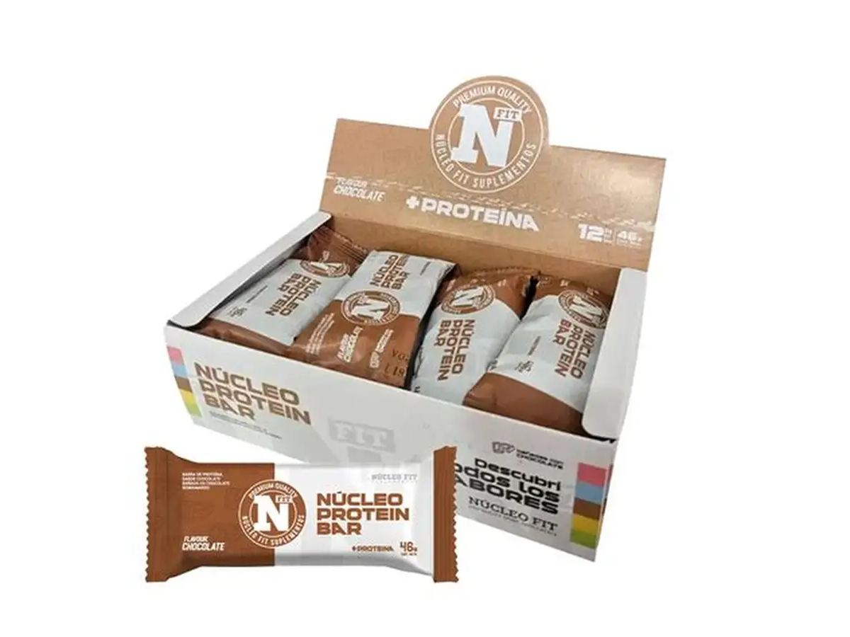 CAJA NUCLEO PROTEIN BAR - (Surtida con todos los sabores) -CHOCOLATE -BANANA -LIMON -FRUTILLA -COCO Barritas de proteínas bañadas en chocolate semiamargo sabor a chocolate/limón/frutilla/banana/coco con 46g por unidad. un delicioso complemento ideal para tu entrenamiento, tus momentos de recarga o breaks. Elaborado con ingredientes de alta calidad y con un alto contenido de proteínas para ayudar a tu alimentación. Blister por 12 unidades Beneficios Clave Alto contenido proteico: Elaboradas con ingredientes de calidad, cada barrita está diseñada para ayudarte a alcanzar tus objetivos nutricionales. Ideal para cualquier momento: Perfectas para llevar en el bolso y consumir en el gimnasio, antes o después de entrenar, o como un snack saludable durante el día. Satisfacción garantizada: Su sabor irresistible y textura suave te motivarán a mantenerte en tu camino hacia una alimentación equilibrada.