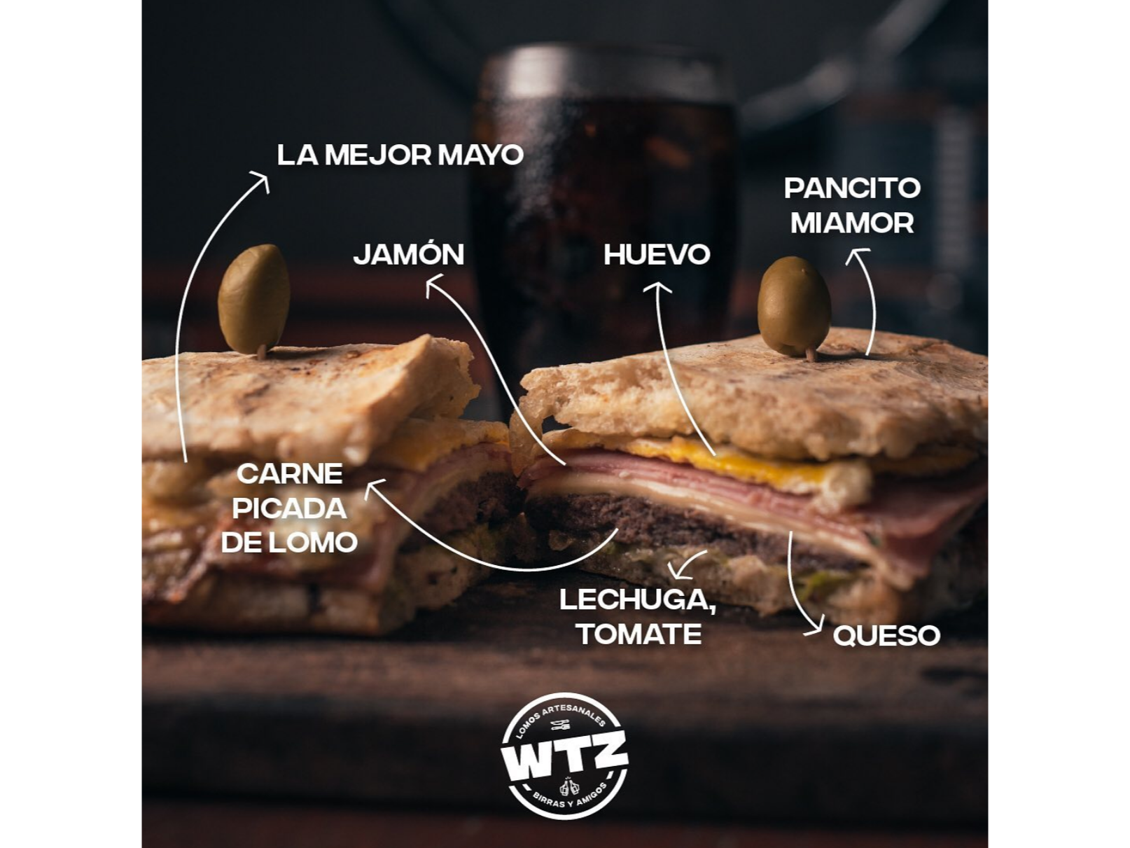 (mayo casera, lechuga, tomate, medallón de 230 gr, jamón, queso azul, huevo y papas caseras)