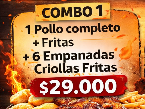 POLLOS A LA PARRILLA Y EMPANADAS Compartir por WhatsApp Copiar enlace PROMOS!! POLLOS PAPAS Y EMPANADAS PROMOS!! (2) COMBO 1 $29.000 COMBO 2 $36.000 POLLOS (4) Sin foto POLLO COMPLETO CON FRITAS $22.000 Sin foto POLLO COMPLETO SOLO $20.000 Sin foto 1/2 POLLO CON FRITAS $15.000 Sin foto 1/2 POLLO SOLO $13.000 PAPAS Y EMPANADAS (2) PORCION DE PAPAS $4.000 EMPANADAS CRIOLLAS FRITAS desde $9.000
