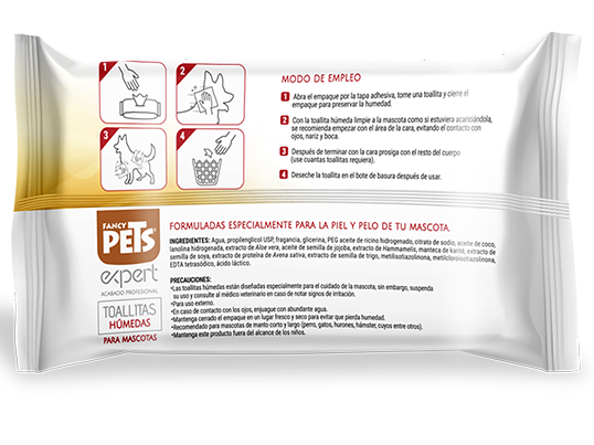 La toallitas de la línea Expert de Fancy Pets, conjunta los beneficios del coco, el aloe vera, la jojoba, la avena, el hammelis, la manteca de karité, la soya y el trigo, al aportar brillo, sedosidad y humectación, brindando un cuidado integro en la piel y el manto de mascotas, al mismo tiempo que las desinfectas con la formulación libre de alcohol, libre sulfatos y parabenos.